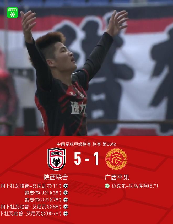 北京时间11月8日,中甲联赛第30轮比赛,陕西联队主场迎战广西平果队。陕西队方面,魏志伟打入两球,此外阿卜杜瓦哈普-阿尼瓦尔上演帽子戏法。广西平果队的迈克尔·楚夸(Michael Cheukwa)点球得分。最终,广西平国1-5不敌陕西联,降级乙级。他在一场重要比赛的第11分钟打进了第一个进球。阿卜杜勒瓦哈普铲球得分。第38分钟,陕西联队1-0领先。第38分钟,魏志伟远射破门。陕西联队2-0 迈克尔第57分钟任意球破门。广西壮族自治区1-2平。第78分钟魏志伟梅开二度,陕西联队3-0获胜。 1 领先。阿卜杜勒·瓦哈普在第 88 分钟打进了他的第二个进球。陕西联队4-1领先。阿卜杜勒·瓦哈普在90+5分钟内完成帽子戏法。陕西联5-1 两队球员均已上场。比赛开始五分钟后比赛中他接到外线远射。球不见了。第11分钟,陕西联队射门取得领先。陕西联队进球。第30分钟,西联1-0领先。迈克尔在进攻区内接球,但被判越位。第33分钟,胡家珍与门将相撞被犯规。第38分钟,魏志伟远射破门。第45分钟和第2分钟,陕西联队将比分改写为2-0。阿兹拉克外围远射,但球被扑出。他们在第57分钟重新取得胜利。进球后迈克尔亲自主罚点球。第66分钟,广西壮大1-2平郭。第66分钟,朱越战术犯规吃到黄牌。第78分钟,魏志伟铲射拿下两分。陕西联队3-1领先。第88分钟,阿卜杜勒瓦哈普射门拿下两分。陕西联队4-1领先。阿卜杜勒瓦哈普完成了帽子戏法,并在 90+5 分钟内完成了帽子戏法。陕西联合d 5-1 球队阵容技术统计